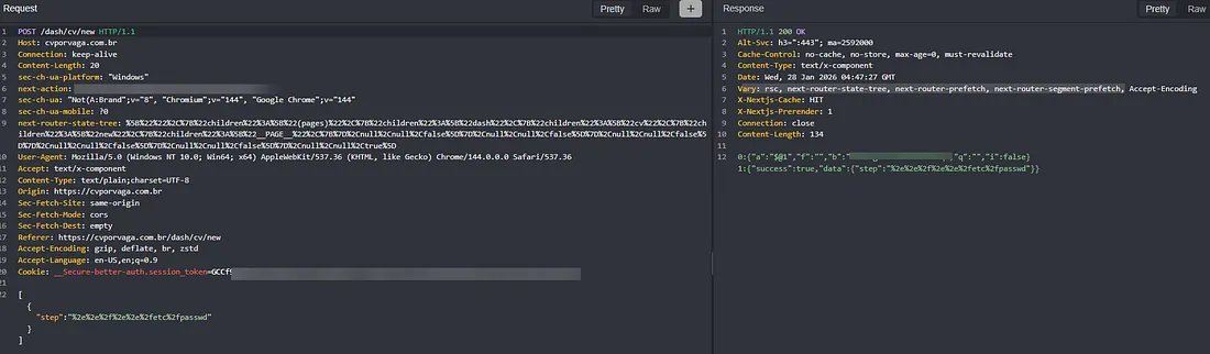 I started manual testing on the /dash/cv/new endpoint. The request sent a JSON body with a step field set to welcome. I attempted to use this as an attack surface for directory traversal or server-side exfiltration. However, the presence of the Vary: rsc, next-router-state-tree... headers confirmed that the application was heavily reliant on Next.js internal routing, which is generally resilient against OS-level interactions unless there’s a massive misconfiguration.