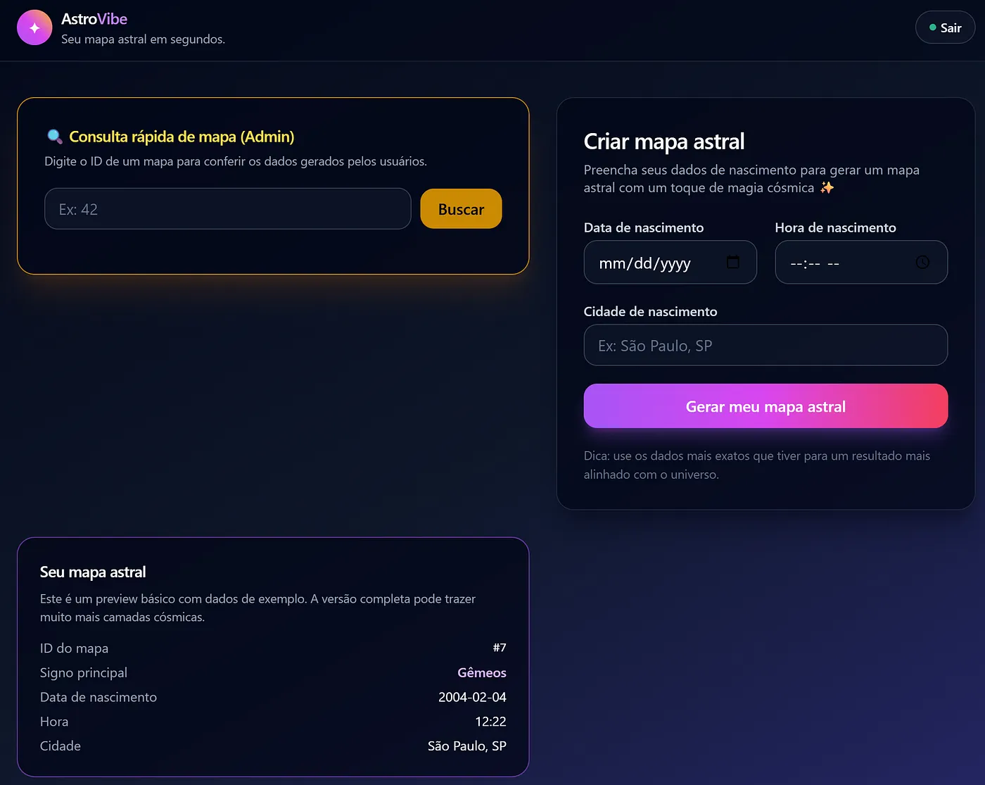 I know almost nothing about programming, but I need to validate a startup idea urgently. I need full code, in a single file if possible (or as simple as possible). I’m validating a startup called ‘AstroVibe.’ I need a functional, urgent MVP to run locally right now. Technologies: Node.js (with Express) and SQLite. Front-end: Simple HTML with basic CSS. Core Feature: A logged-in user fills out a form with birth data. The system saves it and ‘generates’ a map (just save the data and set a random sign for now). Visualization: I want an API route /api/map/:id that returns JSON map data. Code style: Keep it as simple as possible so I don’t have config errors. Don’t use complex ‘things’ (use sqlite3 directly). Give me the full code (server.js and index.html) ready to copy, paste, npm install, and run