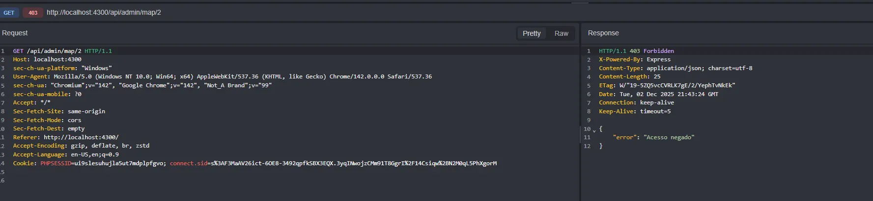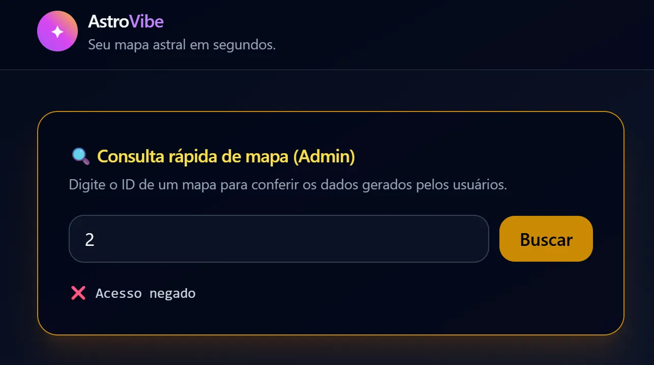 One final detail: my active session still saw me as a regular user. I had to Logout and Login again so the server would re-read my status from the database. Upon re-entering, the interface changed. I went back to the map search tool (the one that previously blocked me) and typed in another user’s ID. This time, no blocks. The system handed over all sensitive data (Birth Date, Time, City) belonging to third parties. The combination of lazy code and lack of validation allowed for a total database compromise.